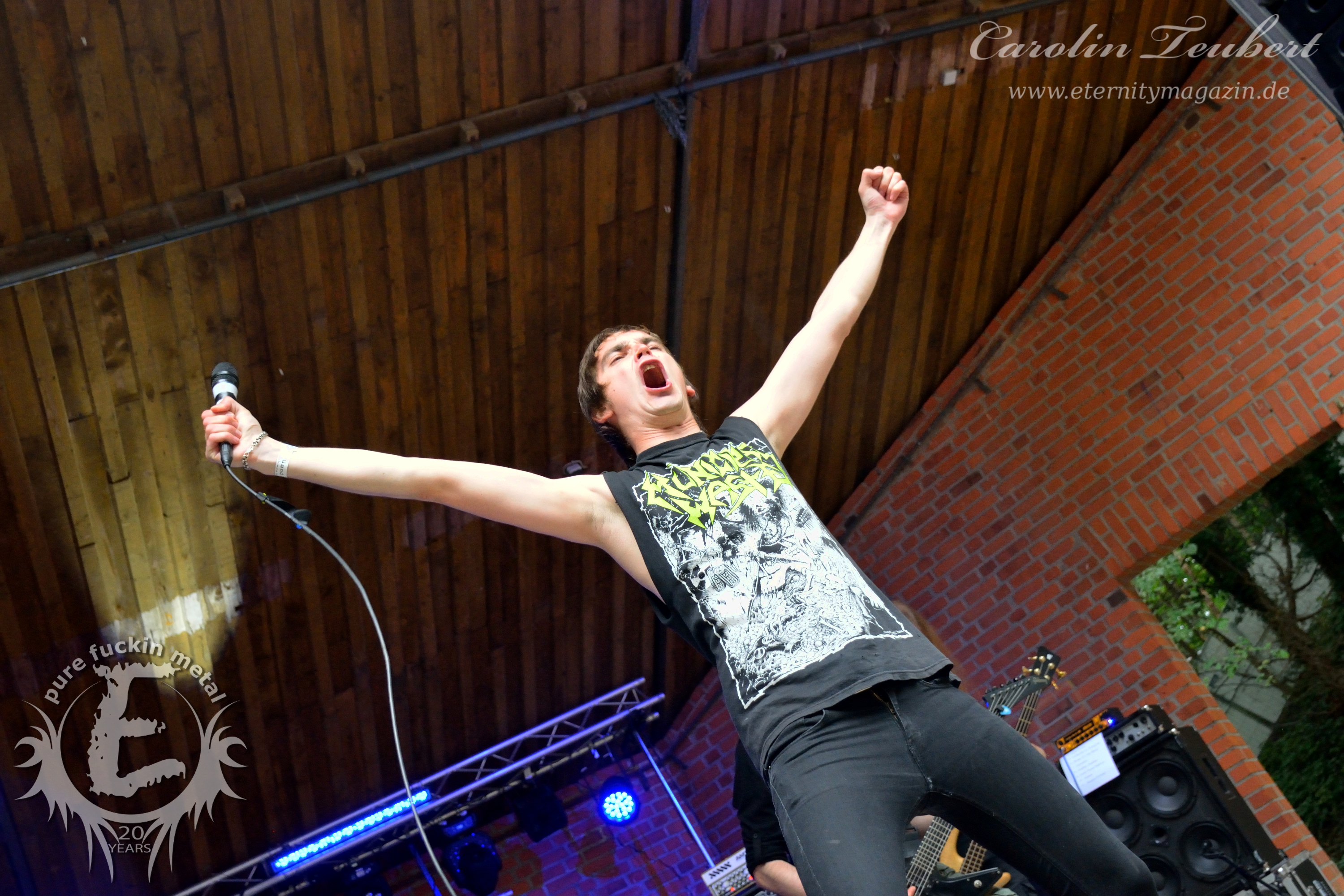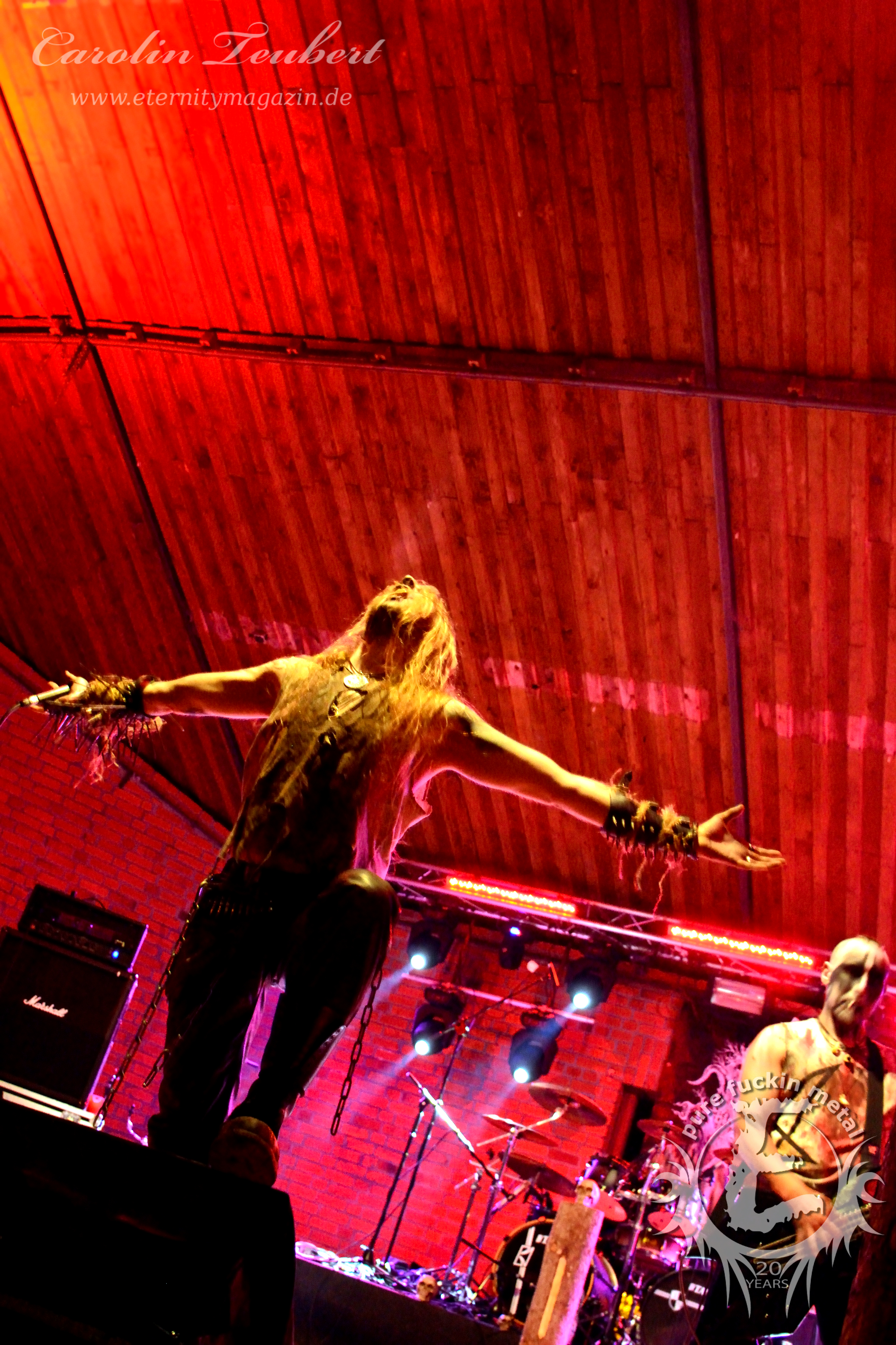 Jene versprechen nach dem Soundcheck sich noch „schnell hübsch zu machen“, was so viel bedeutet wie Corpsepaint und Blut auf das Gesicht zu verteilen. Was man von der ersten Sekunde an sagen kann, ist, dass die Band musikalisch definitiv die bessere Wahl  als die geplanten Hassmord ist. Es gibt viel Gepose mit eher poltrigem Sound, aber zum Wachwerden ist das Ideal. Außerdem muss man die Leistung des Drummers mal erwähnen, der nämlich gerne mal parallel zum spielen auch noch singt. Der Fronter hat zudem richtig viel Energie und wenn er nicht gerade mit der Gitarre umher wirbelt, dann animiert er mit voller Power noch das Publikum. Zum Einstieg also eine solide Black-Metal-Nummer.