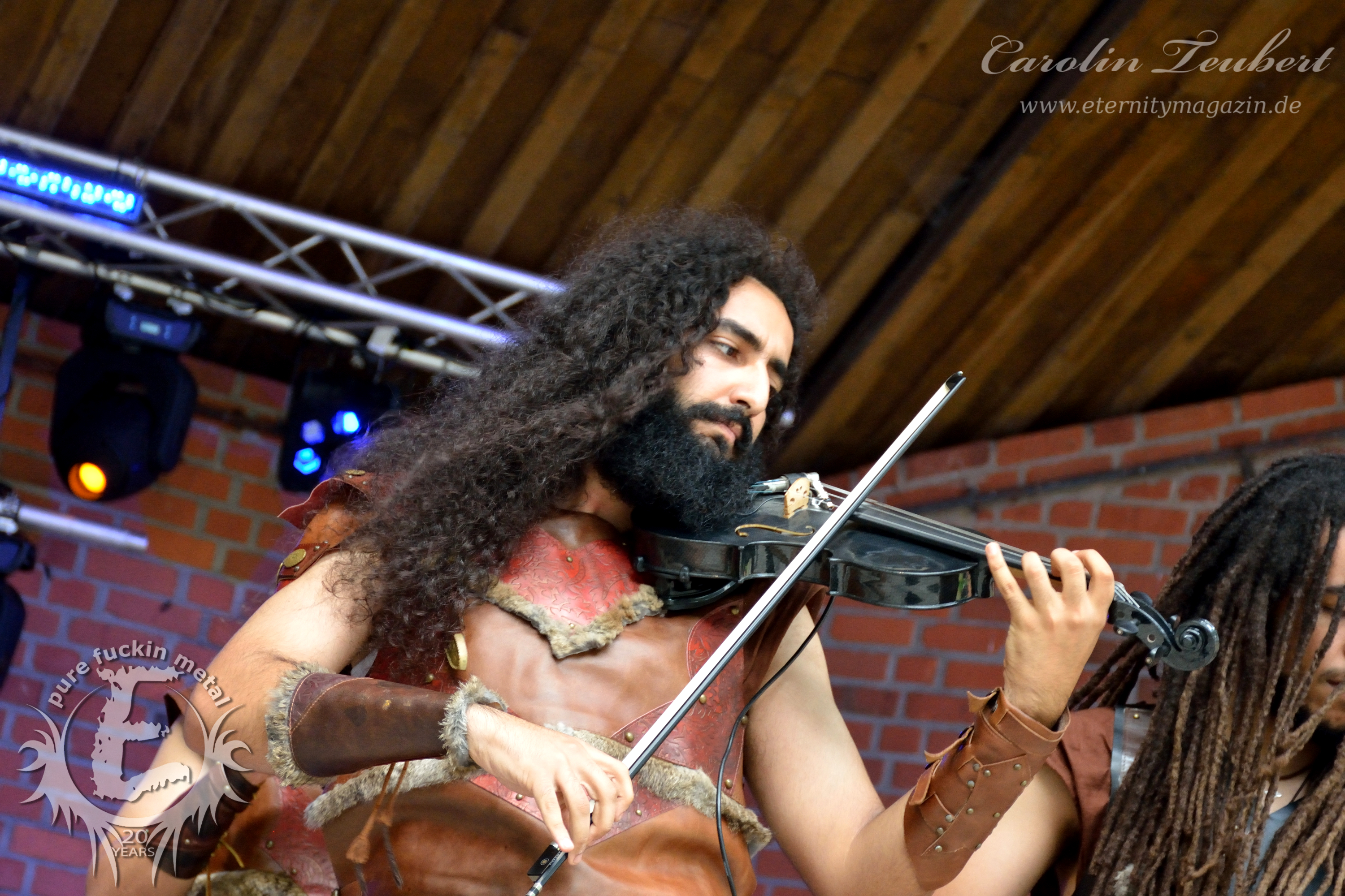 Nachdem am Donnerstagmittag immer mehr Fans den Campingplatz füllen, dauert es nicht lange, bis es mit der ersten Band losgeht. Diese haben auch gleich einen kleinen Exotenbonus. Aus Australien kommen nämlich die Piraten Lagerstein. Vereinzelt in Lederhosen gekleidet, sorgen sie mit entsprechender Gute-Laune-Musik für Stimmung. Mit einem fröhlichen „Ahoi“ folgen Songs, die einen ganz klaren Alestorm-Einfluss haben, aber auch ein bisschen Irish Folk und Oktoberfeststimmung lassen sich nicht verleugnen. Zwischendurch wird ein australisches Biertrinkritual angepriesen, in dem man Bier in einen Stiefel füllt und daraus trinkt, dann folgt wieder Gedudel mit ganz viel Keyboard. Dass die Australier sich mit den deutschen Trinkgewohnheiten bereits angefreundet haben, zeigt der angekündigte German-Drinking-Song „Heut ist so ein schöner Tag“. Lagerstein macht jedenfalls Laune und ist ein guter Opener, um das Festival in Schwung zu bringen.