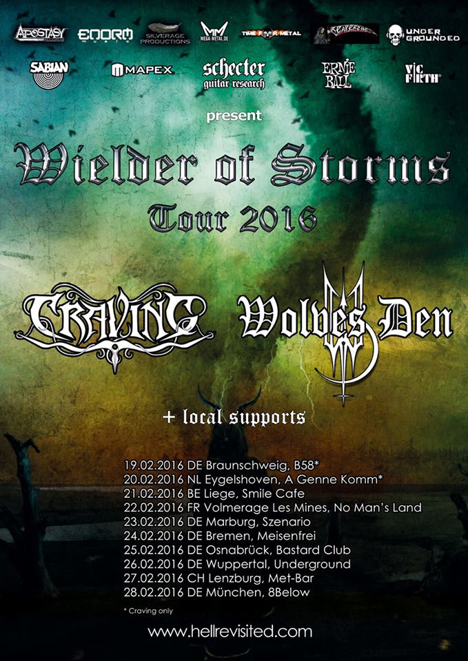 Vom 19. bis zum 28.02. befinden sich CRAVING und WOLVES DEN, jeweils unterstützt von lokalen Support-Acts, zusammen auf Tour. CRAVING präsentieren dabei ihre neue EP „Wielder Of Storms“, die als Appetizer für das kommende Album „By The Storm“ dienen soll, WOLVES DEN bringen ihr im letzten Jahr veröffentlichtes Debut „Deus Vult“ mit. Der Großteil der Konzerte wird in Deutschland stattfinden, es sind aber auch Shows in Belgien, Frankreich, den Niederlanden und in der Schweiz gebucht.