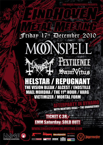 Die Black Metaller Mayhem sind fürs diesjährige Eindhoven Metal Meeting bestätigt. Außerdem spielen Moonspell, Immortal, Rotting Crist, Severe Torture, Pestilence, Finntroll, Exodus, Kreator, Saint Vitus u. a.